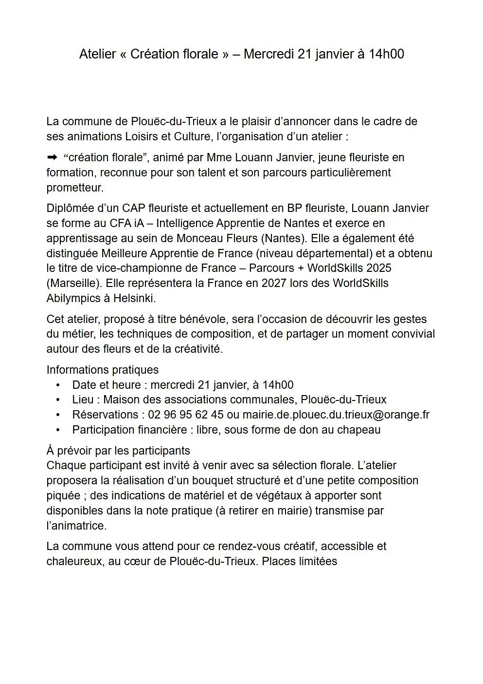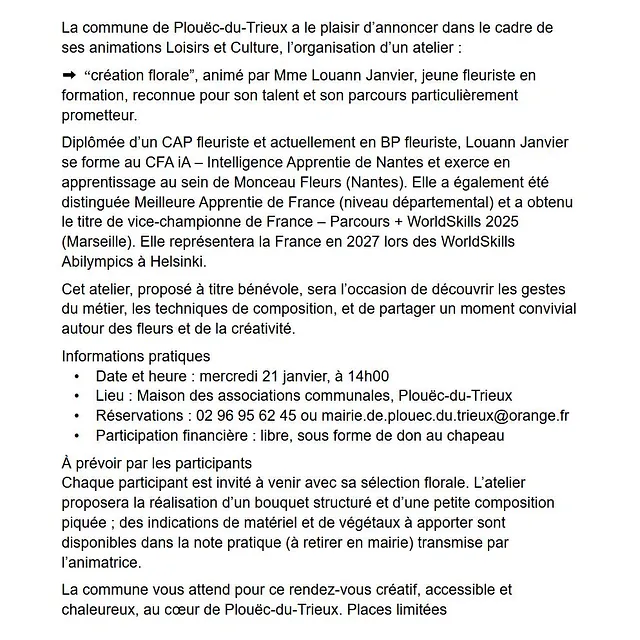 • Réservations : 02 96 95 62 45 ou mairie.de.plouec.du.trieux@orange.fr
