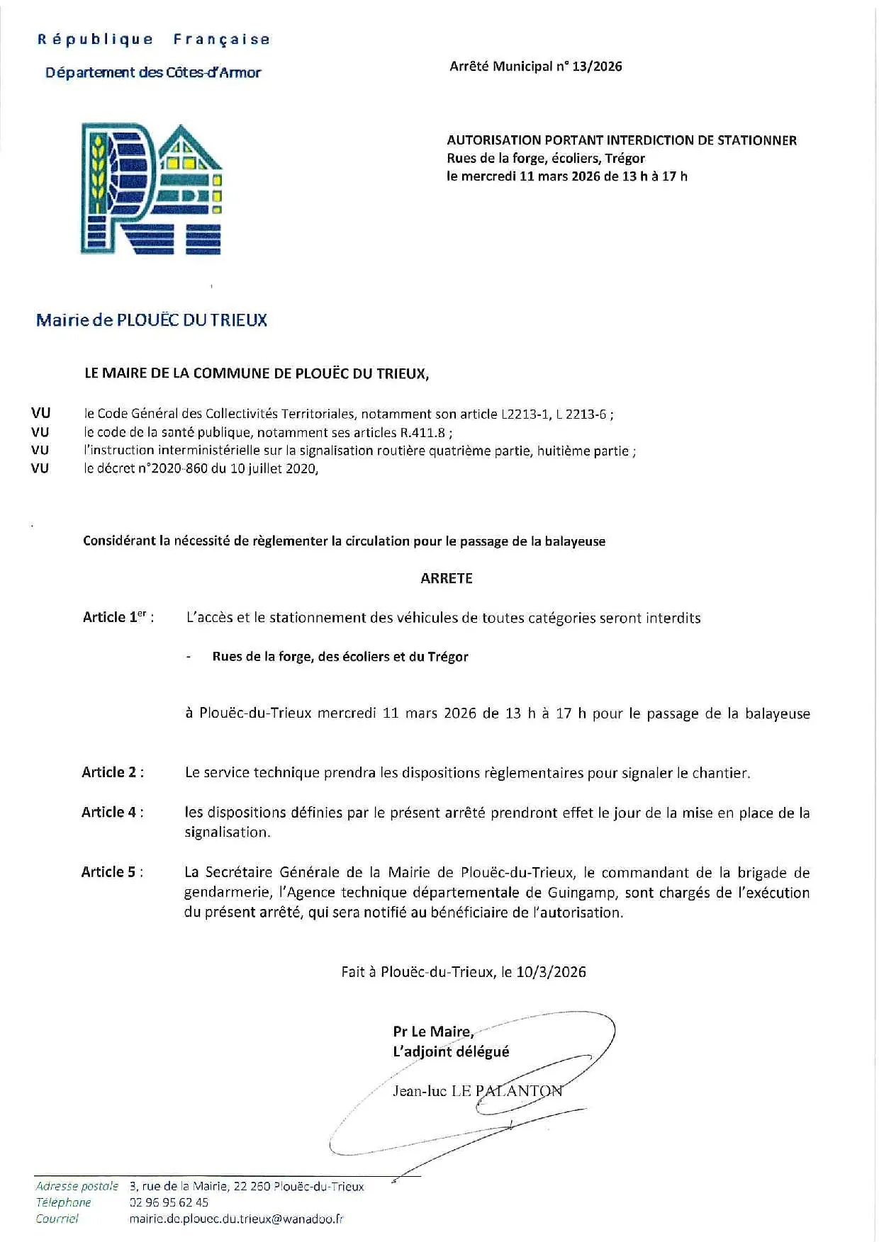 L'accès et le stationnement des véhicules de toutes catégories seront interdits dans les rues de la Forge, des Ecoliers et du Trégor.