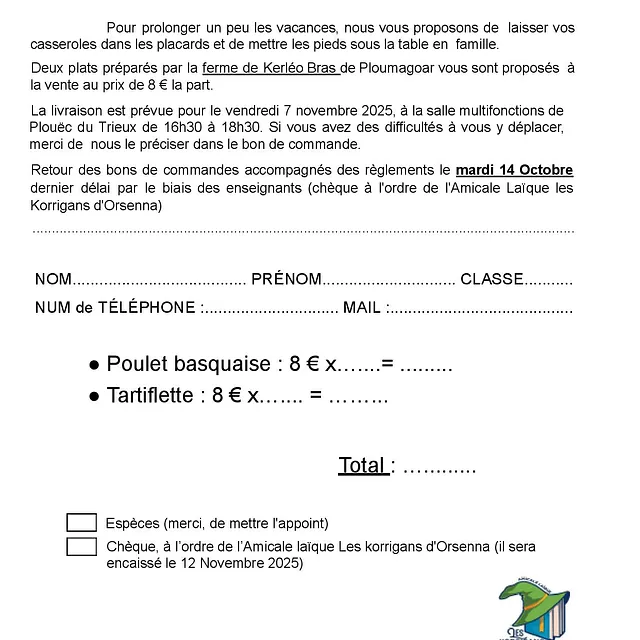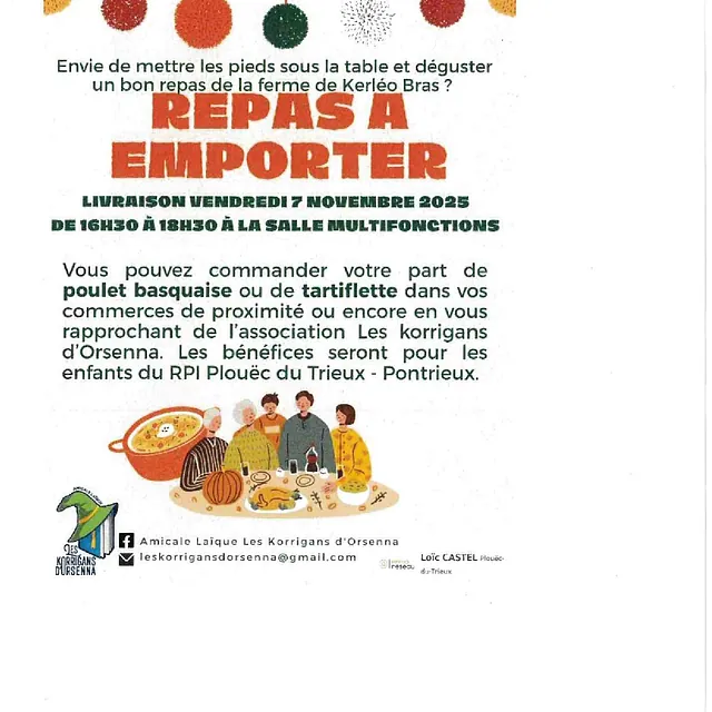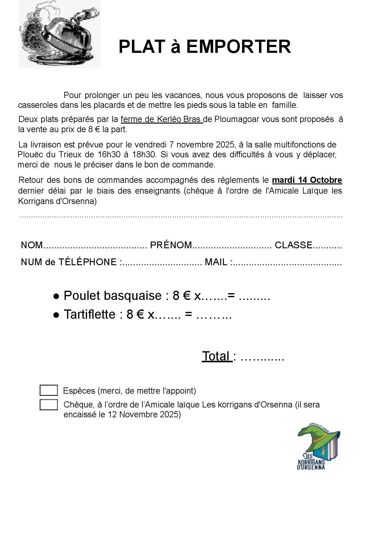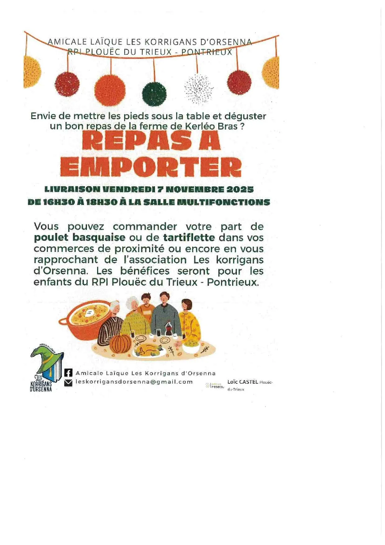L'amicale laïque Le Korrigans d'Orsennavous propose ce repas à emporter