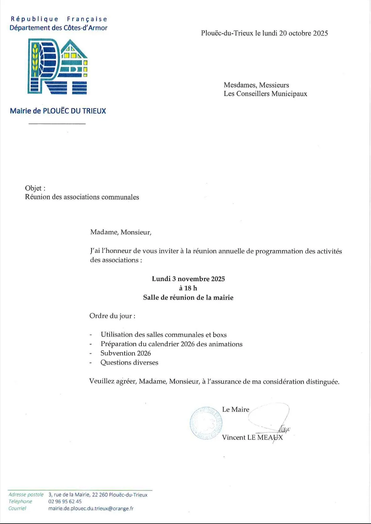 Réunion des associationsLundi 3 novembre 202518h00 - salle du Conseil