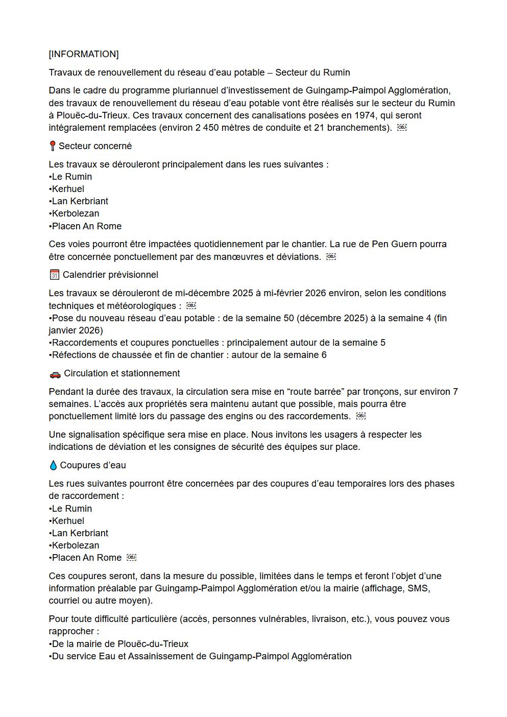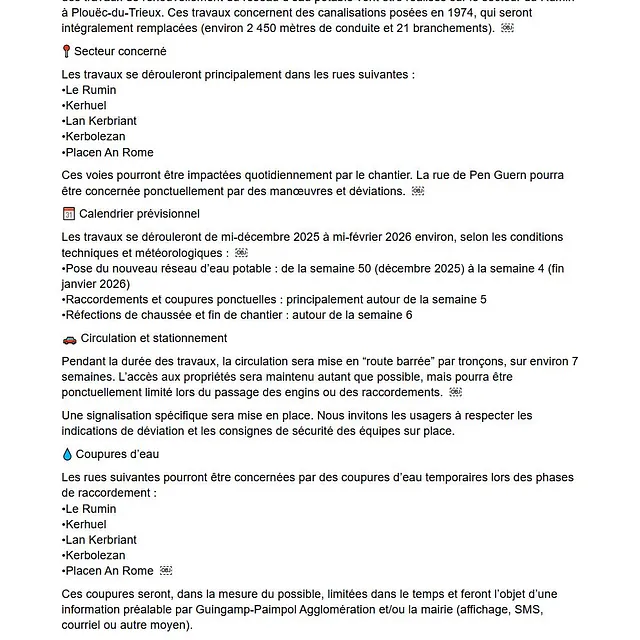 Les travaux se dérouleront de mi-décembre 2025 à mi-février 2026 environ, selon les conditions techniques et météorologiques